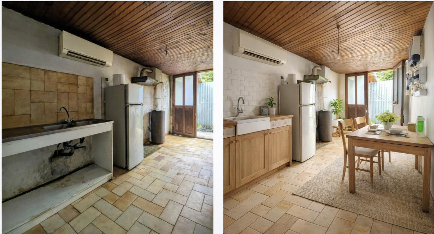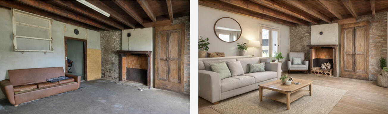 Comparaisons avant / aprèsLes visuels réalisés sont des propositions d’aménagement virtuel destinées à aider les acheteurs à se projeter dans le potentiel du bien.